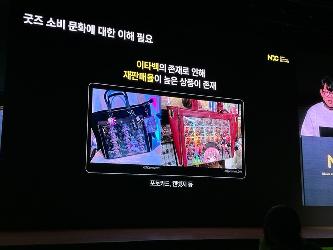 プレゼンは『NIKKE』ならではの成功事例に移動。『NIKKE』の戦闘シーンを再現したアクリルジオラマやTCGを紹介しつつ、ユ・ヒョンソク氏は各国のカルチャーに合わせたグッズ展開も意識しなければならないと続けます。この例として日本の痛バッグなどが挙げられ、これは韓国にはないオタク文化としたうえで、このおかげで缶バッジの売れ行きが好調になっていると紹介します。