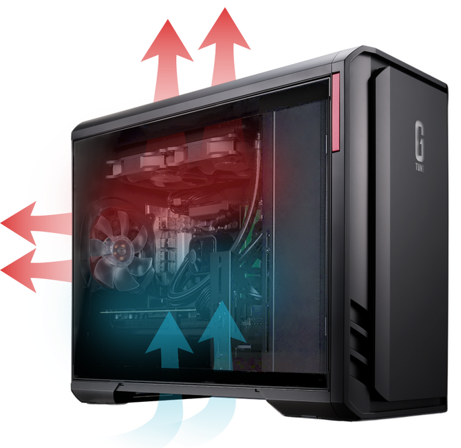 フロントパネルの中央には新しいG TUNEのロゴ、フロントパネル周囲にはLEDライティング、いずれもG TUNEのブランドカラーであるレッドで施しています。BTOカスタマイズでは、レッドのLEDケースファンを搭載可能。電源を入れると筐体内部を照らせます。また、全てのモデルでガラスサイドパネルを標準装備しています。