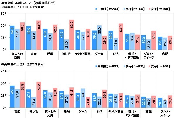 ソニー生命調べで生きがいについて質問したところ、男子中学生では1位は「ゲーム」(50.0%)2位は「友人との交流」(43.0%)という結果に。男子高校生は1位が「ゲーム」(39.0%)2位が「音楽」(37.8%)となりました。