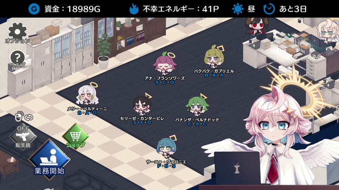 しかし、雇用するのは下級の天使であるため、能力が低くて使えない人材も……。そんな天使は記憶も魂もリセットする「転生銃」で撃って再転生させ、パラメータを再抽選すると良いでしょう。弾がある限り、優秀な天使が来るまでなんどでも再抽選できます。