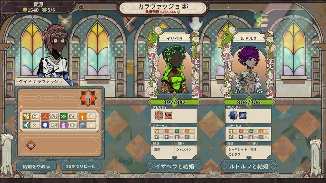 本作でユニットを増やす手段は2つあり、いずれも特徴的なフレーバーを有しています。1つ目は結婚です。独身のユニットで実行可能で、自身の強さに応じた婚姻対象がランダムで登場します。相手のアビリティおよびステータスは開示されており、リロールもゴールドの限り可能なので、優れた結婚相手が見つかるまで厳選を楽しめます。