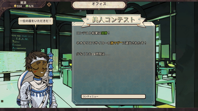 また、ビジュアル、サウンドと並んでゲームを彩る上物であるテキストもまた、負けじと癖が強いものとなっております。腹に一物あるキャラクターたちとの会話はコミカルかつ個性的なものばかりで、目を見張るべきはローカライズの見事さです。本作の翻訳は『多砲塔神教』や『Helltaker』の有志翻訳で名高い陽炎01型氏が担当しています。ストラテジーに造詣が深く、よくマッチした濃いキャラ付けが巧みな同氏と本作はベストマッチと言えます。大仰でネタが豊富な会話の数々が、幅広い語彙とキャラ付けの引き出し豊富に訳されています。これだけ癖が強いゲームの中でテキストが全く埋没しておらず、シビアなストラテジーの彩りとして十二分に機能しています。