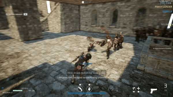 次に近接戦闘に関して紹介されており、プレイヤーには初期装備として剣と盾が与えられ、敵に応じてより有効な武器に持ち替えたり、銃を装備中にも腕に結わえられたバックラーで敵の近接攻撃や矢をパリィすることが可能とのこと。