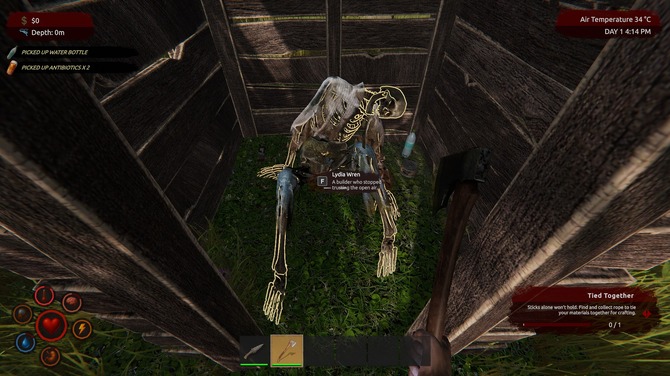 主人公が目を覚ますと、そこはプロジェクトの舞台となる島でした。島の内部には木々が広がっていて、そこら中に元テスト参加者と思われる骸骨があり、彼らの遺した日記なども閲覧できます。ゲーム内では、島に落ちている木の棒を拾ったり、武器を作って野生生物を倒したりするチュートリアルクエストも用意されています。