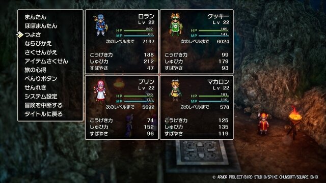 パーティメンバーは全員LV22でスタートしており、マカロンのHPはローレシアの王子に続いて2番目に高い数字でした。MPは3番手とやや少なめですが、それでも最下位のローレシアの王子と比べれば2倍近くあり、それなりの頻度で「じゅもん」や「とくぎ」が使えます。