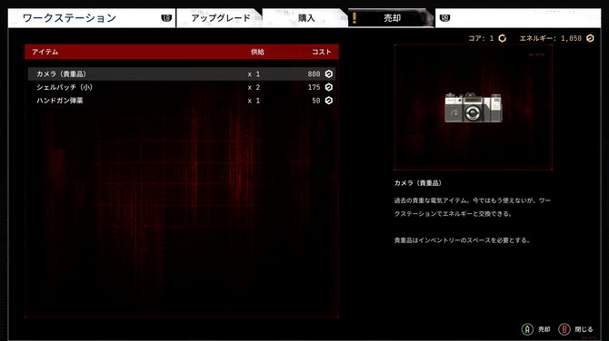 各武器はエネルギーを使用して強化することが可能で、激しさを増すバイオマスとの戦闘を有利に進めるためには必須の行動となってきます。武器のアップグレードについては少量のエネルギーを支払うことでリセット可能であるため、新たな武器へと気軽に乗り換えることが可能。一方でスーツなど強化に「コア」を使用するアップグレードはリセットができないため慎重に検討する必要があります。