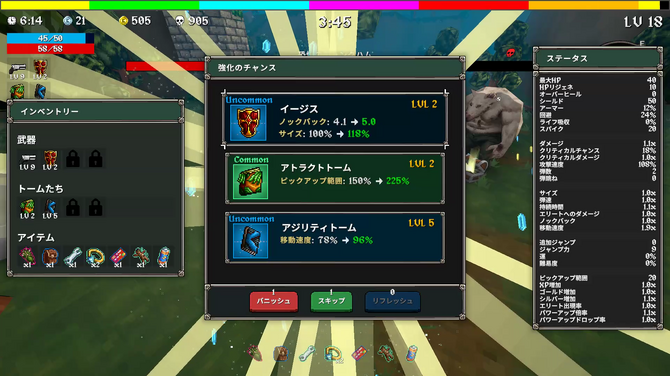この軽いノリは、『ヴァンサバ』ライクなら必要不可欠のアップグレード要素にも表れています。前述したように本作は3Dアクション。そのため「多段ジャンプ」「ジャンプ距離の向上」といったアップグレード要素を選択できますが、こう見えて高所からの落下ダメージがシステム的に用意されているため、調子に乗ってジャンプを伸ばすとオブジェクトや敵の攻撃も相まって、簡単に自滅します。
