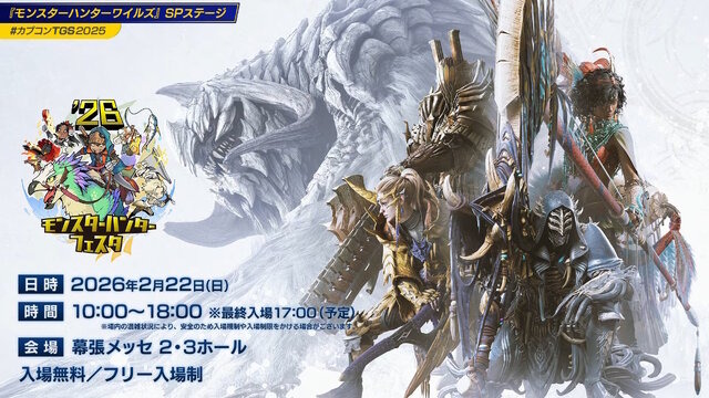 シリーズのお祭りイベント「モンスターハンターフェスタ'26」が幕張メッセにて2026年2月22日に開催されます。例年通りフリー入場制です。また、会場では全国のハンターが腕を競い合う「モンスターハンターワイルズ 狩王決定戦2026」も実施されます。狩王決定戦のクエストや応募方法は今後発表予定です。