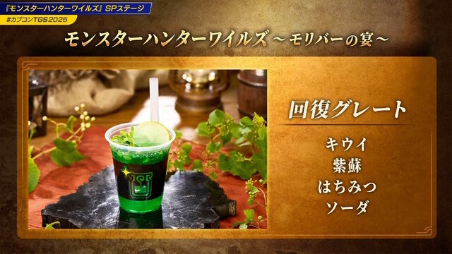 店内は「緋の森」にあるモリバーのアジトを再現。各集落の食事の盛り合わせや焚き火料理をイメージしたフード、回復薬グレートのドリンク、ラバラ・バリナをイメージしたデザートなどが展開されます。