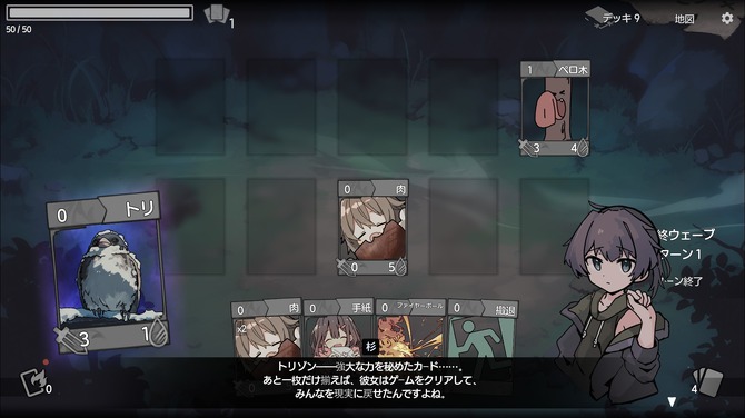 筆者がストーリーモードを通して育成したカード「宅配ヒトデ王様収穫祭(2)ネコカニ彼岸花反物質(3)雪嵐旋風火葬イグルー生贄子ヤギ天罰(2)手紙チョウリサイクル雨」は、初手で手札に必ず揃い、なおかつ場に出したら敵の場を完全制圧、ほぼ勝ちが確定する……という1枚で、もはやインフレが指摘され続けて数年経つ某オフィシャルなカードゲームですら裸足で逃げ出す性能のカードを本ゲームでは作り出すことができるのです。