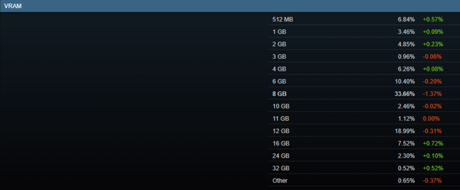 VRAMにおいては8GBが未だ最多であるものの、シェア率は前月比で1.37%減少して33.66%に。一方で16GBは0.72%上昇し7.52%に達するなど、徐々に8GB以外へと移行する様子を見せています。