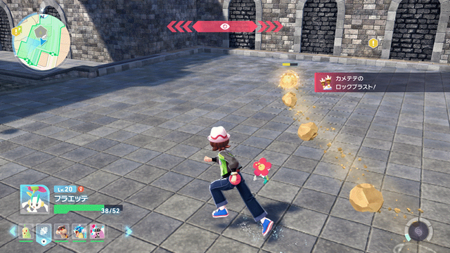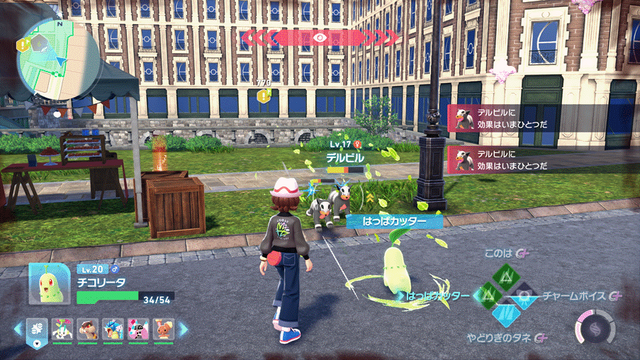 しかし本作は探索と戦闘がもっとシームレスで、ABXYのボタンにトレーナーのアクションとポケモンの技が振り分けられており、ターゲットをロックオフ時はトレーナーのアクション、ロックオン時はポケモンの技に切り替わるので、使い分けが重要になってきます。