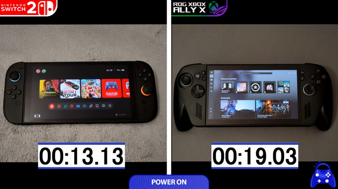 まずは、電源投入から動作可能になるまでの時間の比較です。これはスイッチ2が13.13秒、Xbox Ally Xが19.03秒と、スイッチ2の方が速めです。