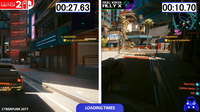 『サイバーパンク2077』を用いた、同一場面のロード時間の比較も行われています。スイッチ2は27.63秒、Xbox Ally Xでは10.70秒と、ロード時間はXbox Ally Xが優位なようです。