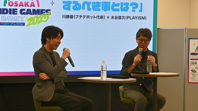 トークセッションには、間もなくTVアニメも放映開始となる『グノーシア』開発のプチデポット代表・川勝徹氏。そして、『グノーシア』や映画化もされた『8番出口』のパブリッシングも手がける「PLAYISM」運営のアクティブゲーミングメディアより、水谷俊次氏が登壇。