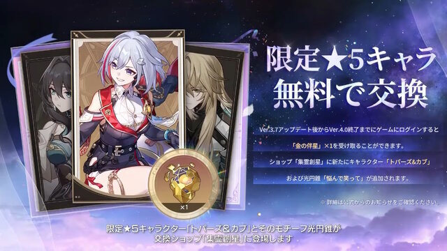また、Ver.3.7アップデート後~Ver.4.0終了までにログインすると「金の伴星×1」を受け取れます。さらに交換ショップでは、ラインナップに「★5 トパーズ&カブ」が追加されます。