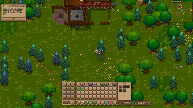 ゲームはプレイヤーが創造したワールドに放り込まれる状況からスタート。基本設定だと近くに最初のNPCである長老の家があり、まずはチュートリアルに従って木の伐採やクラフト、地下探索などの基礎を学び、最後にプレイヤーの拠点である「開拓地」を作り上げることが目標になります。