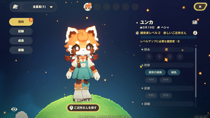 各キャラクターには、主人公との関係性を示すステータス画面のようなものがあります。条件を満たしてより親密になるともらえる報酬があったり、次第に新しい章が読めるようになる専用の掘り下げテキストがあったりするのは『どうぶつの森』とは明確に異なるノリで、HoYoverse味を感じる部分です。