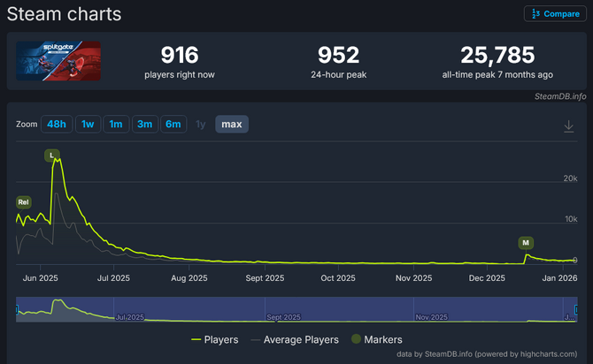 外部サイトSteamDBのユーザー数の推移を見ると、『Splitgate 2』サービス開始直後は約25,000人という最大同時接続数を記録したものの、12月の再始動直後も最大同時接続数は2,000人前後。最近は最大同時接続数1,000人未満という状況が続いていることが確認できます。
