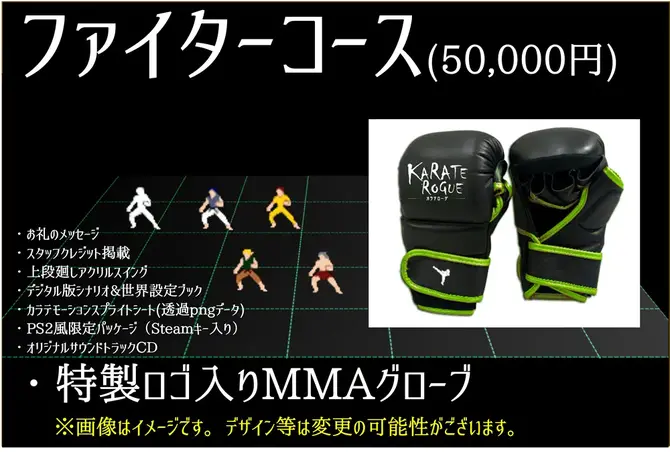 そんな本作をよりクオリティアップすべく、本日2月12日よりクラウドファンディングが始まりました。クラウドファンディングのリターンにはSteamゲームコードはもちろんのこと、サウンドトラックやゲーム内のコンテンツに参加できる権利、変わったところではMMA(総合格闘技)向けグローブや『RPGツクールMV』向けプロジェクトファイル一式などが提供されます。