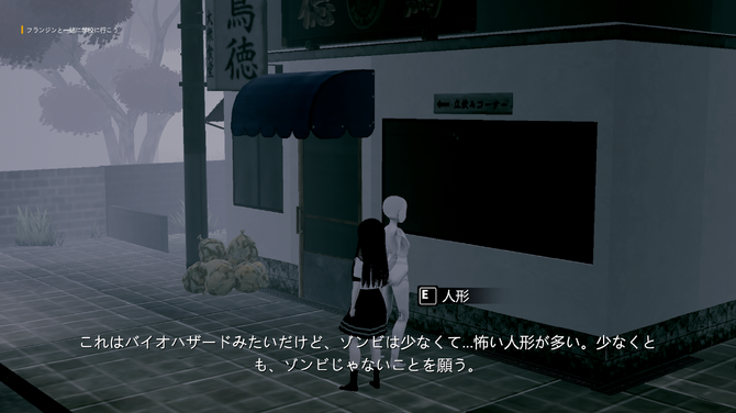 フランジンに案内されたのは、ドールタウンにあるコンビニ。ここで、「やるべきことをやれ」と言われたのでしぶしぶ探索を開始。