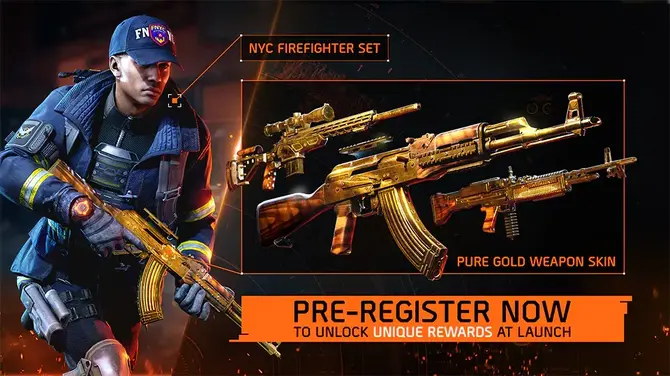 3月31日のローンチまでに事前登録をすると、限定アイテムの“NYC Firefighter Set”と“Pure Gold Weapon Skin”が贈呈されます。 どちらもスキンなので性能に影響はありません。