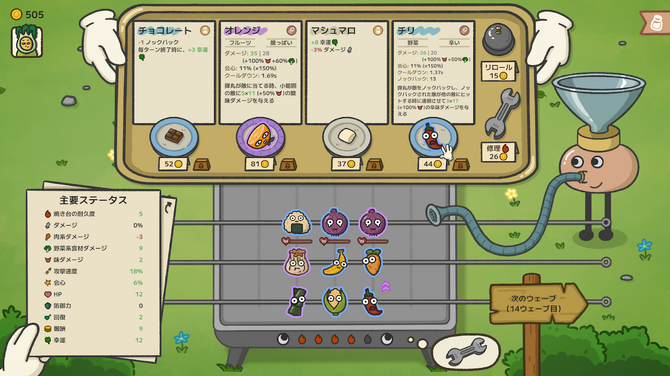 また、ウェーブ終了毎に食材や調味料を購入したり焼き台のダメージ回復を行えるショップのようなものが利用できるのですが、ラインナップは完全にランダム。序盤にバランスブレイカー級の調味料が来て、早々と最強ビルドが爆誕することもあれば、欲しい食材に巡り合えず苦戦を強いられ続けることもあります。