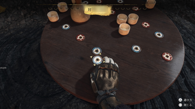 「銭弾き」は『ヨウテイ』の本編に登場したミニゲームです。銭を指で弾き、別の銭1枚だけに当てると得点が入ります。他の銭に当たったり、落としてしまったら自分の番は終了。相手に交代します。R2トリガーで銭を弾く強さを調整するのですが、これがかなり難しく思うようにいきません。本編で銭を当てるのに失敗したあと、対戦相手のNPCに一気に勝ち点まで取られ、苦い思いをした方もいるのではないでしょうか。