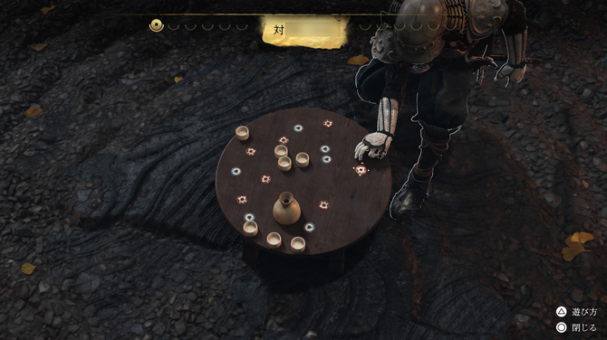 「稽古台」も、『ツシマ』から登場するおなじみのミニゲームです。表示されたボタンを覚え、素早く正確に入力するとクリアです。こちらでは「標準稽古台」と「百鬼稽古台」の2つの難易度で遊べます。
