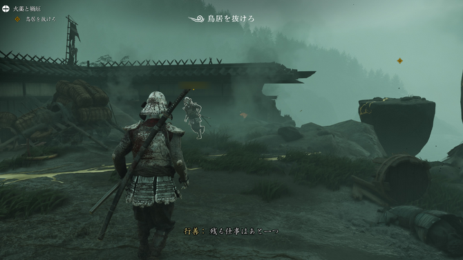 ムービーが終わると、語り部の「行善」による洒落た語りとともに簡単な「チュートリアル」が始まります。「行善」は『ゴースト・オブ・ツシマ(以下、ツシマ)』の『Legends/冥人奇譚』から登場しているお馴染みのキャラクターなので、またあの語りを聞けるんだな…と懐かしさを感じました。