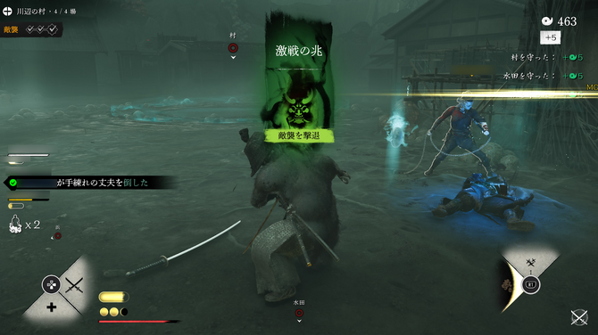 ボス格の敵「手練れの丈夫」は、攻撃力が高く体力も多い上、ガードが固くなかなか崩すことができません。1人では厳しいため、味方と2人で挟むように攻撃していきます。