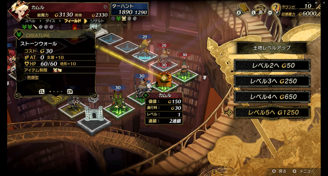 マップは通常の表示のほかに、クリーチャーモードがあり、一目で属性やステータスを分かりやすく表示することもできます。土地が連鎖した時や、あるいは奪われて連鎖が少なくなった時には、土地の価値がどう変化したのか倍率が表示されます。土地をレベルアップすると、土地がせりあがって、ビジュアルで高レベルの土地が分かりやすくなりました。