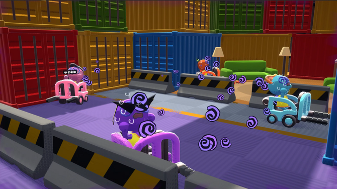 本作ではステージ上にさまざまなギミックが用意されており、フォークリフトの運転を妨げるものが至る所に仕掛けられています。運転を誤り、乗せた荷物が散らばると周囲の荷物やフォークリフトにもぶつけて被害が拡大したり、卵を運送中に落として割ると散らばった黄身白身でスリップしたり……大変混沌とした状況がプレイヤーたちを待ち受けます。